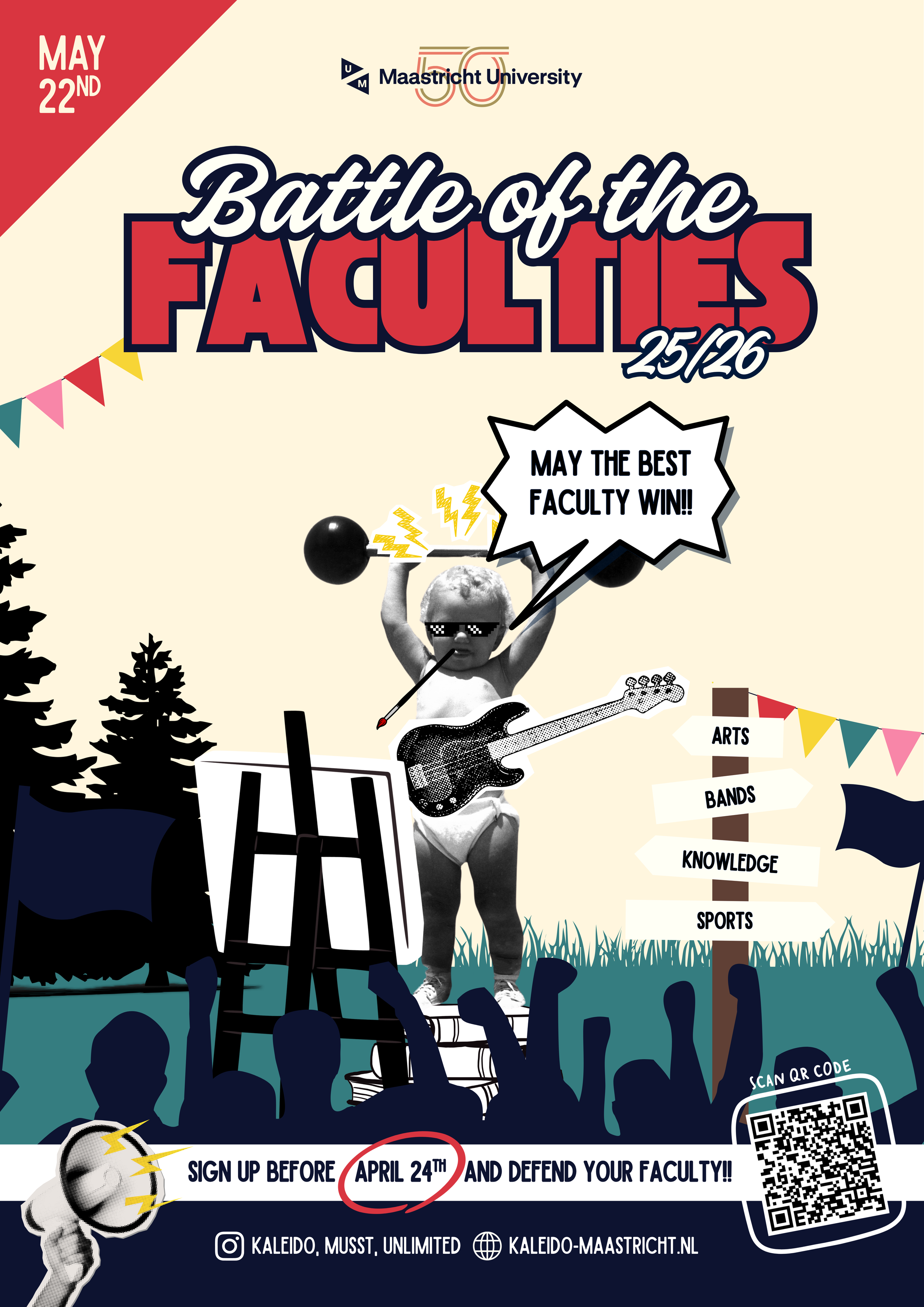 The Battle of the Faculties is an annual Maastricht University-wide initiative that brings together students and staff from all six faculties through a series of friendly competitions. The programme consists of four core components: sport, knowledge, music, and art. Across these events, faculties earn points that contribute to one overall title: Faculty of the Year.